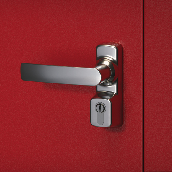 The self-locking system, available as standard on the central locks and top/bottom vertical closures, ensures compliance with the safety requirements to doors equipped with panic bolt as well. The use of a high performance engineering polymer in the areas of higher stress, allows to considerably reduce the opening force, without jeopardizing the mechanical strength.