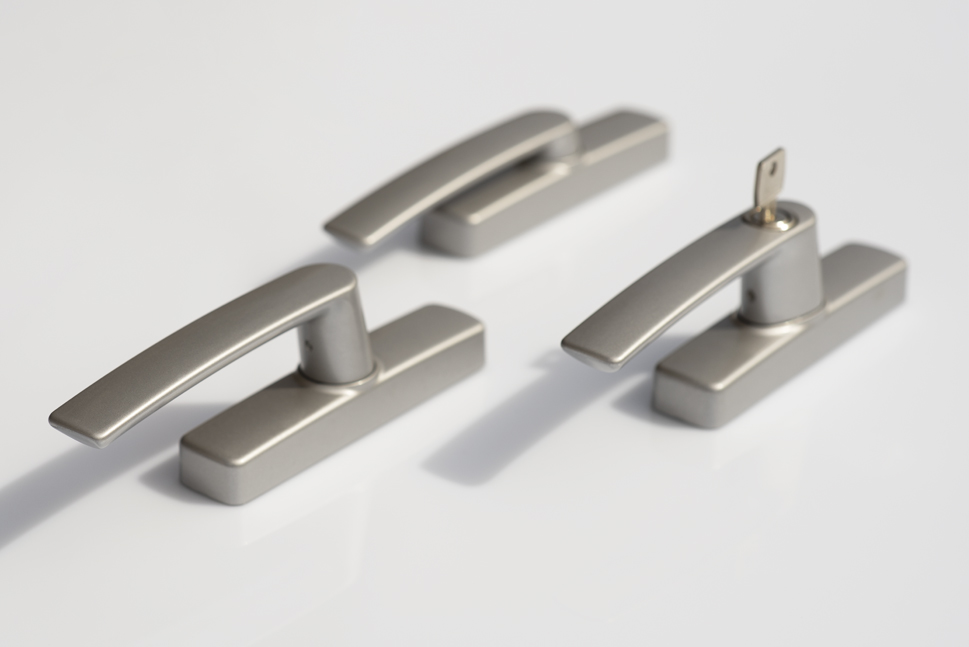La martellina Eos è utilizzabile per aperture ad anta ed anta-ribalta e disponibile in un’ampia gamma di finiture. Le sue versioni si sono arricchite di recente: alle classiche con chiave e con perno da 23 e 43 mm, si sono aggiunte infatti le versioni con manico deviato, anche nella tipologia dotata di spessore 10 mm per un’ergonomia della presa del manico ancora più efficace e la versione con selettore a chiave ideale per le applicazioni su manovra logica e braccio multifunzione LIMITE.